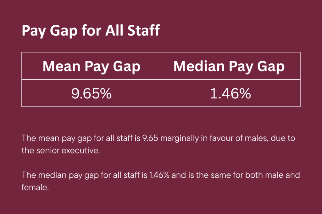 The mean pay gap for all staff is 9.65 marginally in favour of males, due to the senior executive.