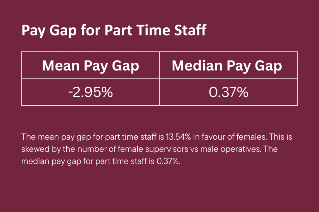 The mean pay gap for part time staff is 13.54% in favour of females. This is skewed by the number of female supervisors vs male operatives. The median pay gap for part time staff is 0.37%.